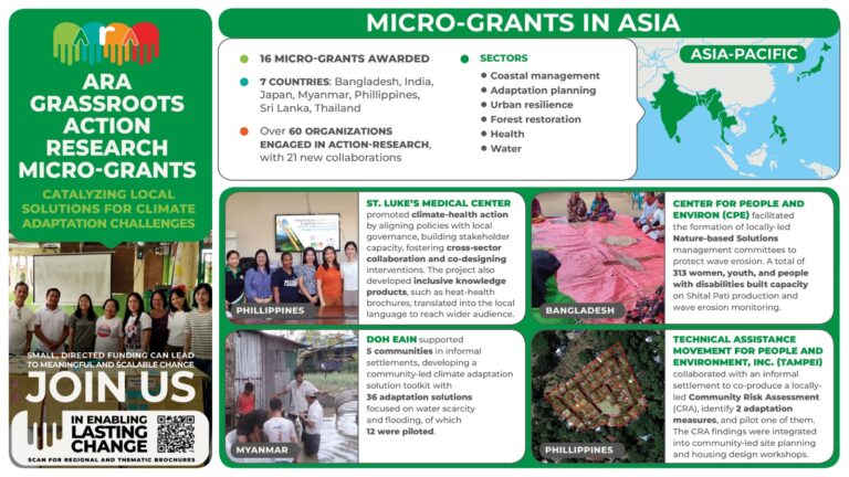 Microgrants in Asia highlight locally led climate adaptation supported through ARA Microgrants in the Asia‑Pacific region. The brochure shows that 16 microgrants were awarded across 7 countries. It covers sectors including coastal management, adaptation planning, forest restoration, health, and water. Over 60 organisations are engaged in action research, with new collaborations developed. Case examples show community‑led solutions in informal settlements and climate‑health initiatives. The brochure illustrates how small grants support inclusive and practical adaptation grounded in local contexts.