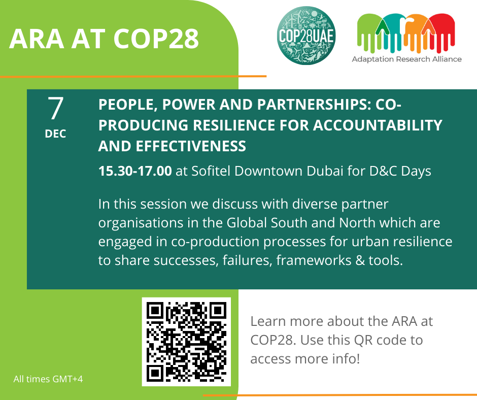 In this session we would like to convene a discussion with diverse partner organisations in the global South and North engaged in co-production processes for urban resilience to share successes, failures, frameworks and tools.