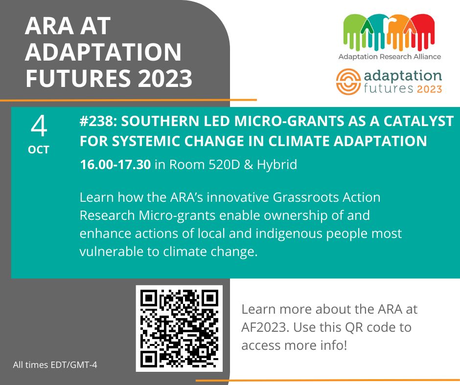 Through listening to the voices and experiences of the ARA’s Grassroots Action Research Micro-grantees (small grants given to 60 local organisations based in the global south for undertaking action and research on adaptation). This session will showcase how the micro-grants act as a tool to enable ownership by, and as a result concentrate actions on local and indigenous people most vulnerable to climate change in the following ways: