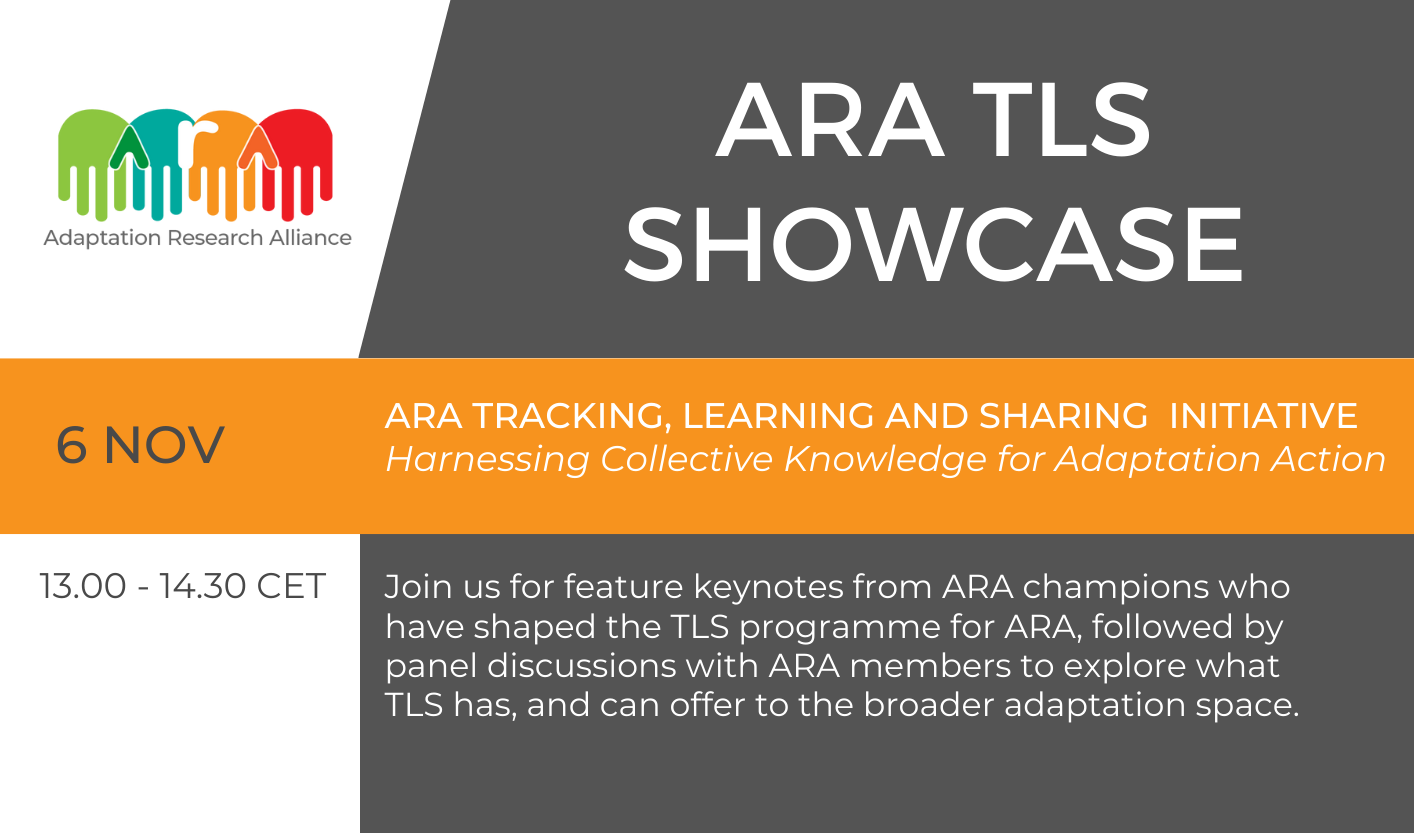 A virtual event where we will showcase the Tracking, Learning, and Sharing (TLS) initiative of the ARA, highlighting impactful adaptation research and learning exchanges from the Global South.