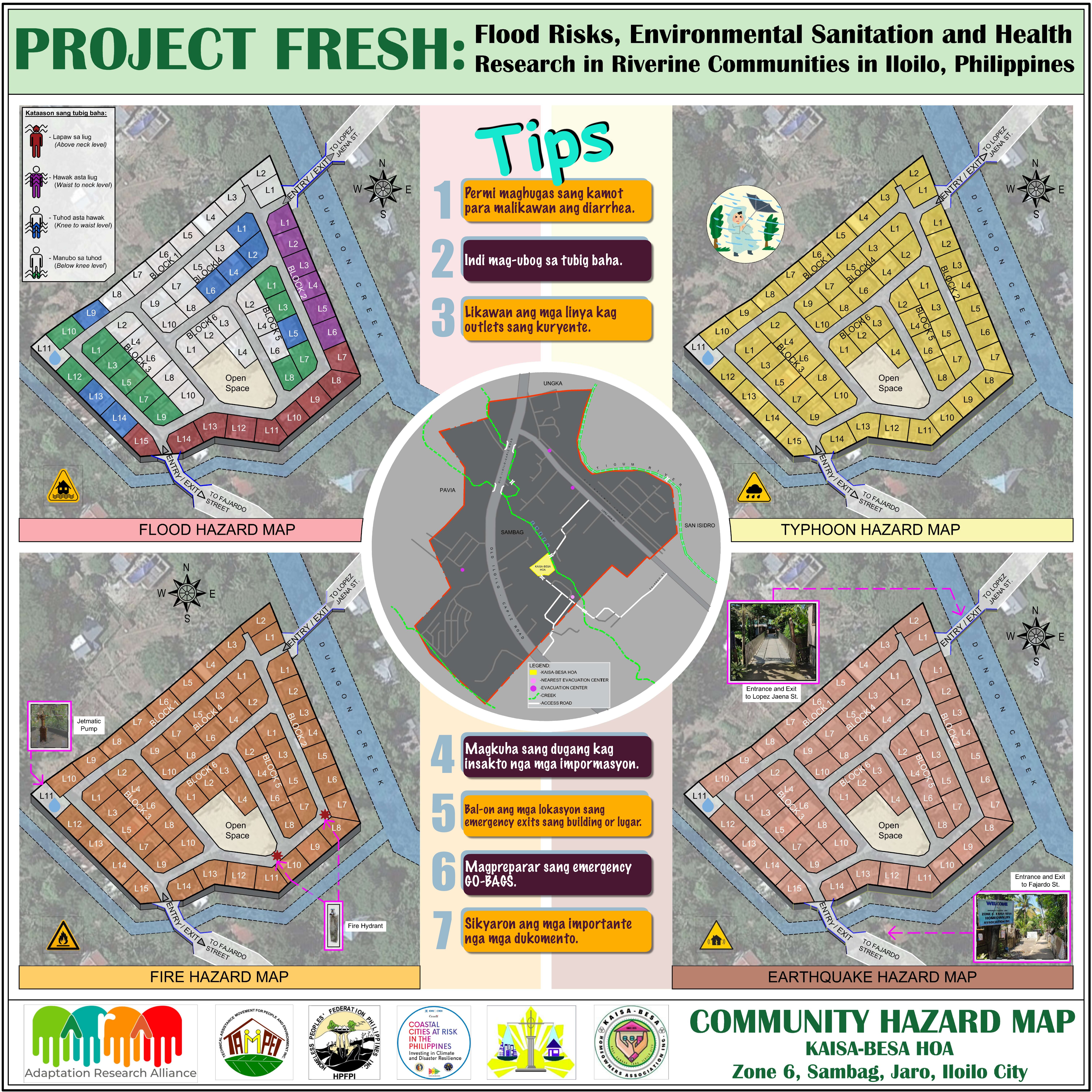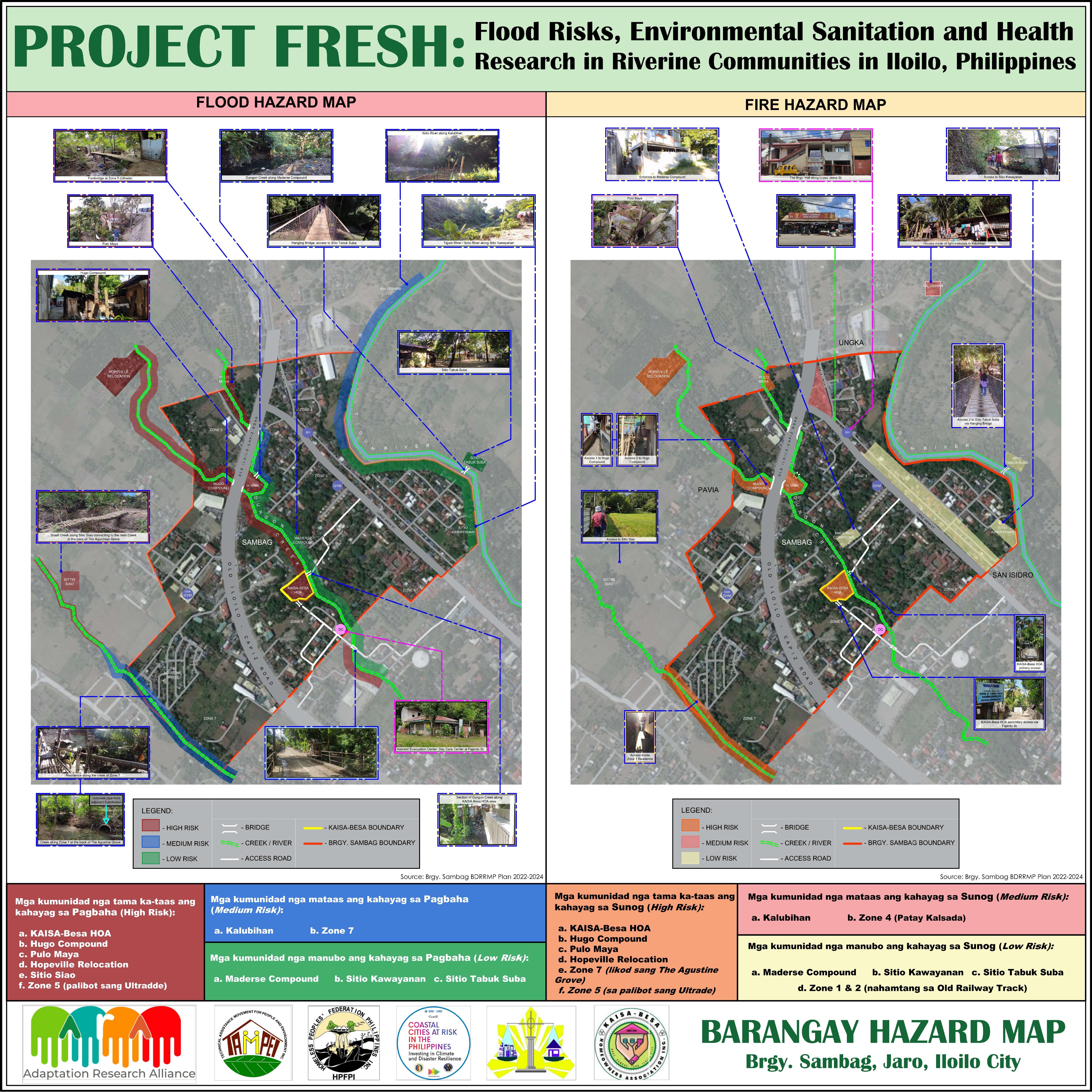 This hazard map of Barangay Sambag in Jaro, Iloilo City identifies communities with high, medium, and low levels of flood and fire risk to support disaster preparedness and community resilience.